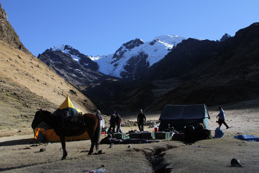 A descida ao acampamento Jahuacocha foi tranquila. O acampamento fica às margens da lagoa com os picos Rondoy, Jirishanca e o grande Yerupajá ao fundo.